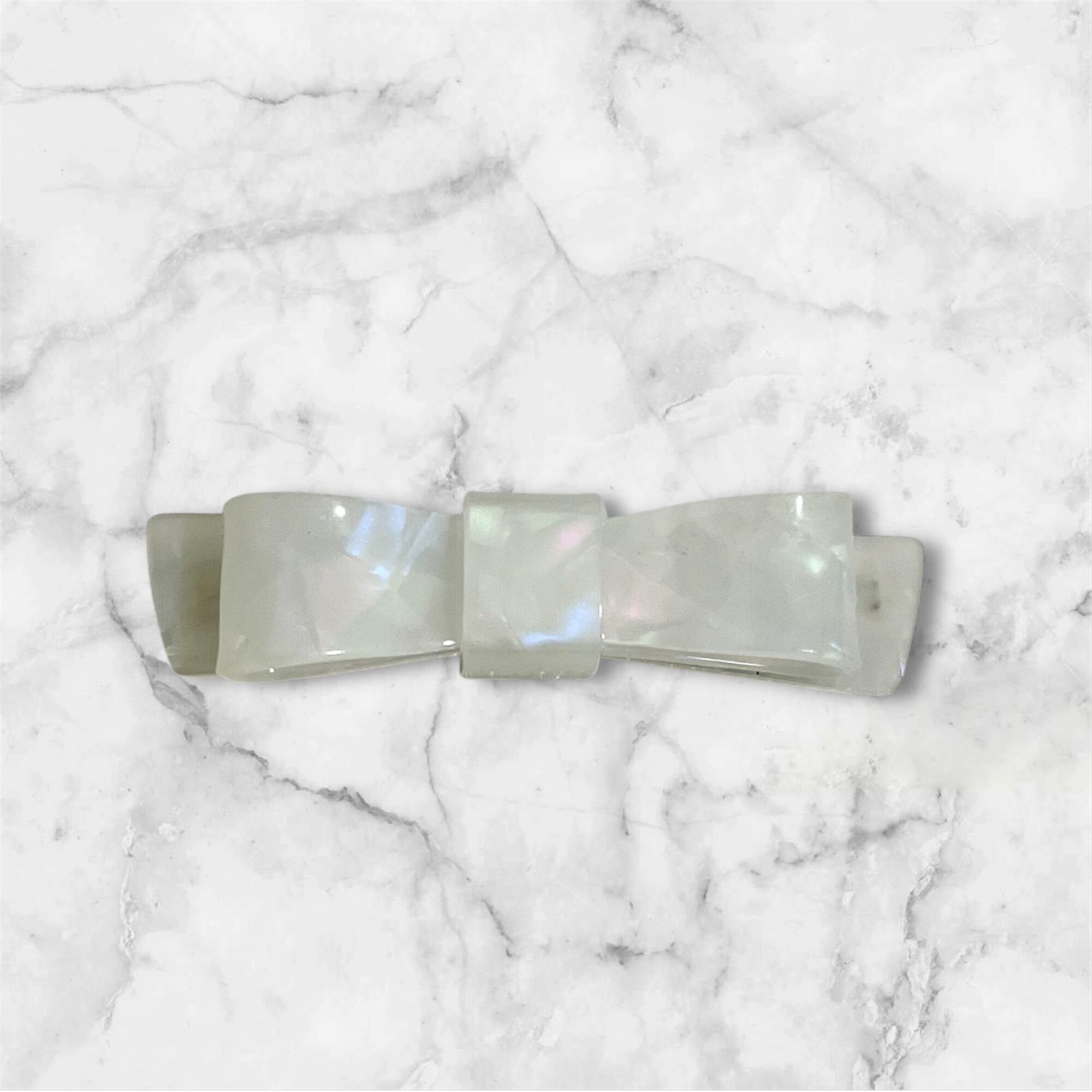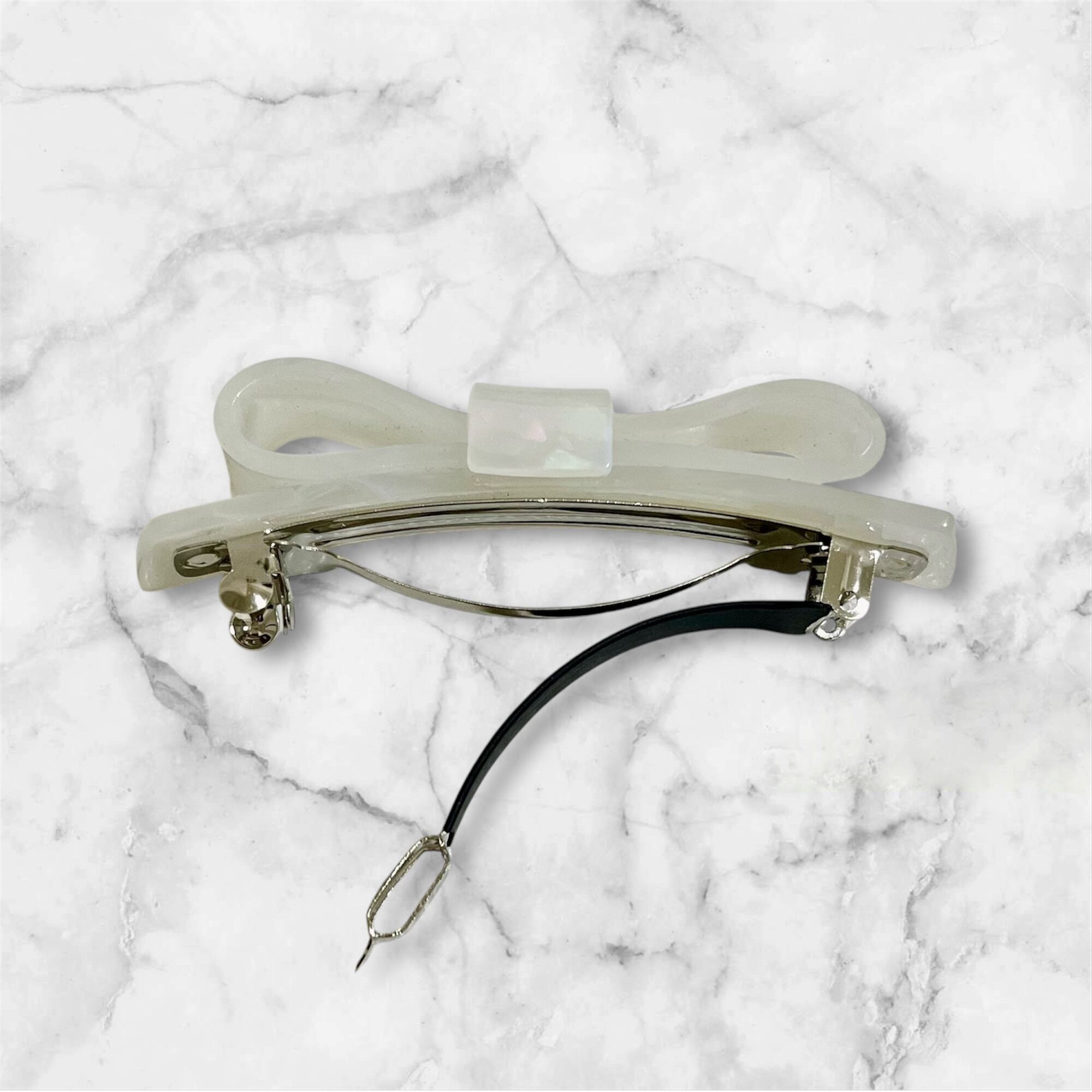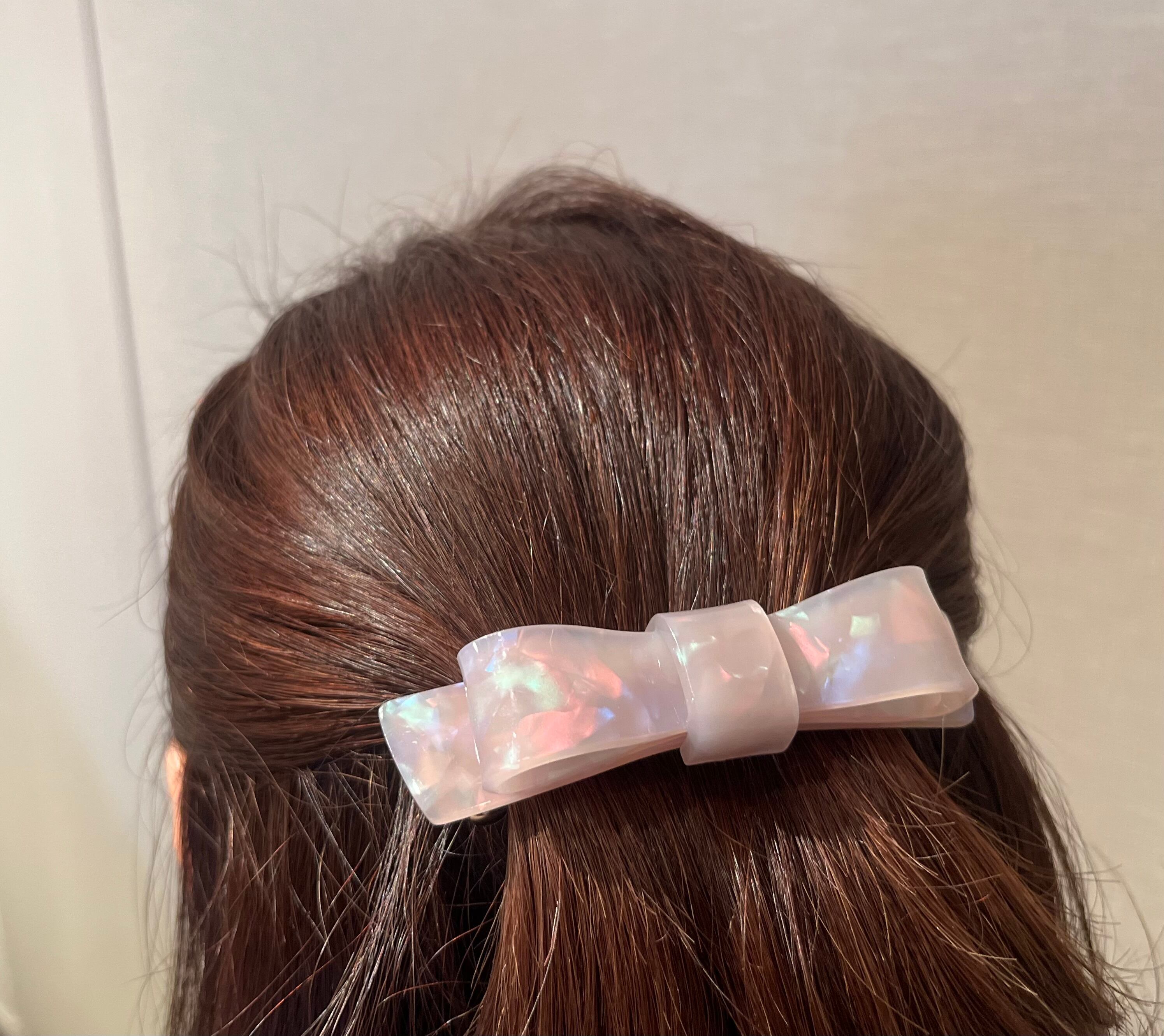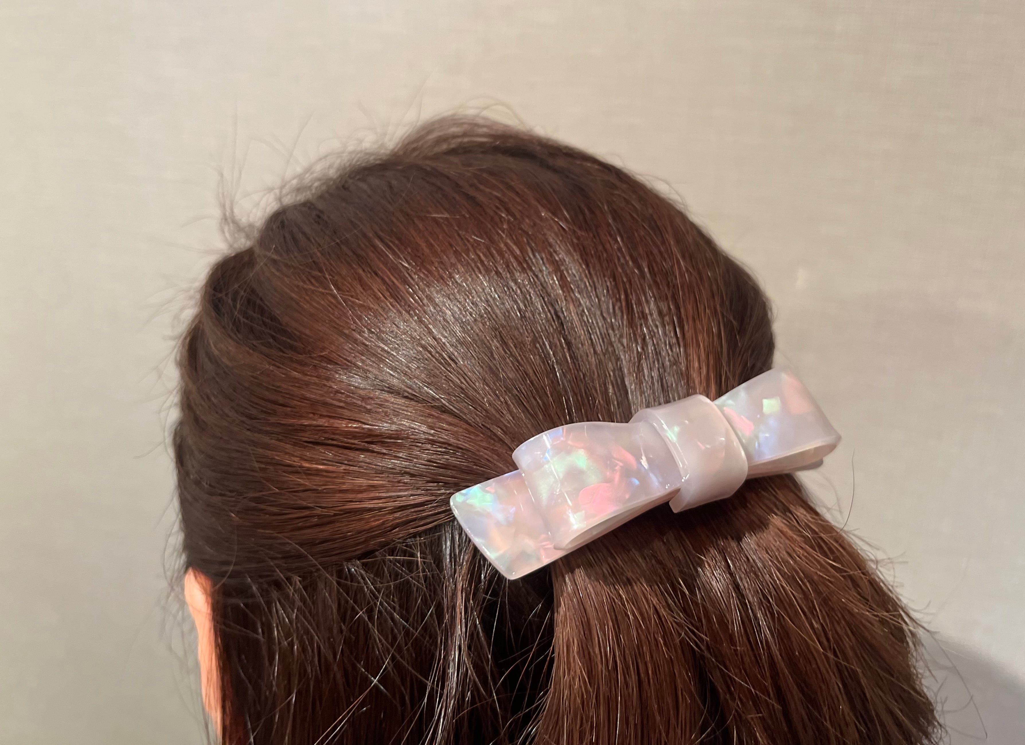 可愛らしいリボンデザインが特徴で、シェル風の上品な輝きが髪型にエレガントさを与えます。